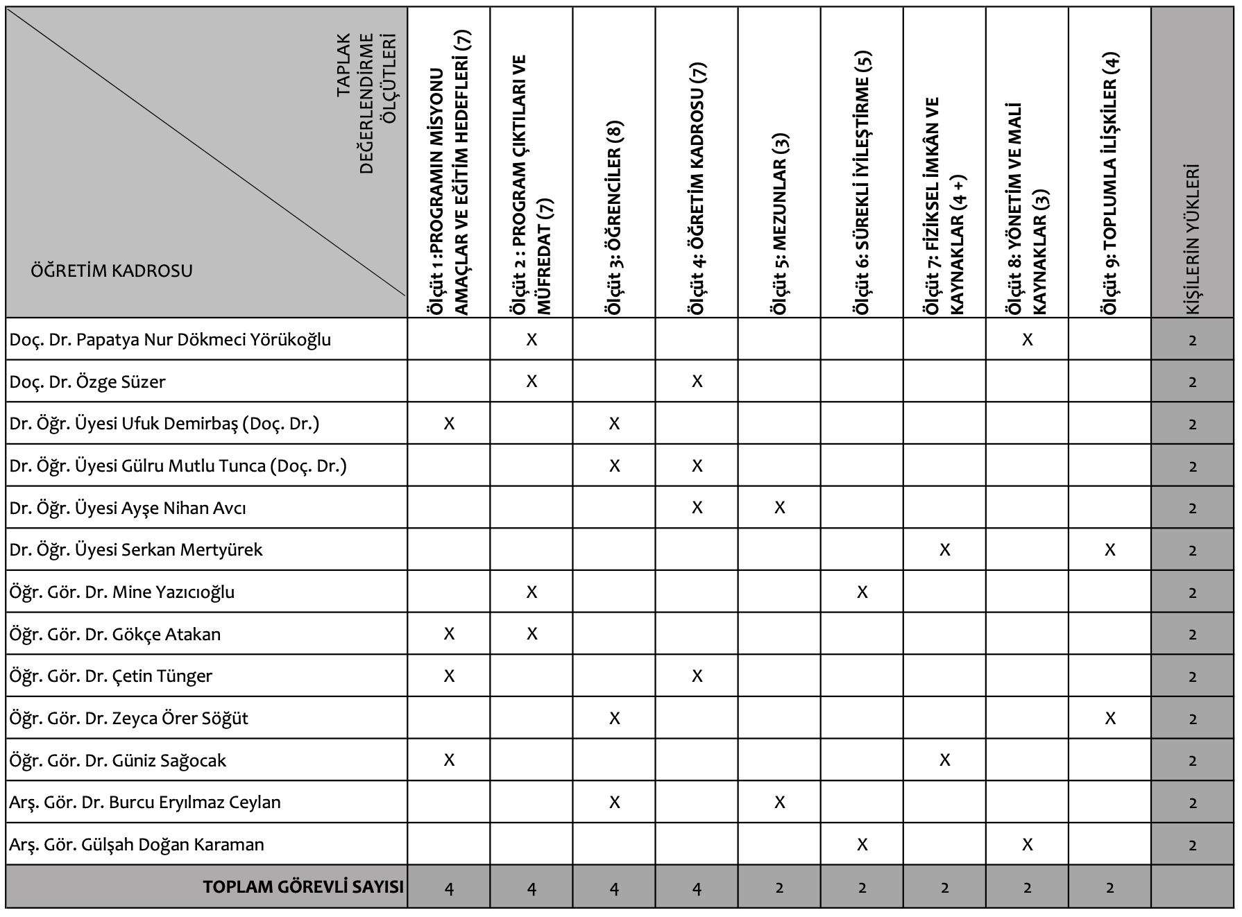 ÖDR yazımı için oluşturulan ölçüt bazlı çalışma grupları ve görev dağılımları: