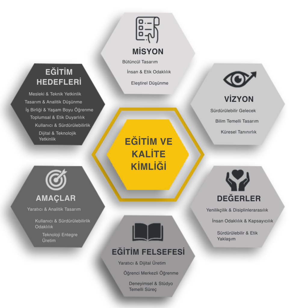 Programda; bilgisayar destekli tasarım yazılımları, sayısal üretim teknikleri, güncel sektör yazılımları ve yapay zekâ destekli tasarım araçlarının etkin kullanımı temel bir eğitim bileşeni olarak yer almaktadır. Bu araçların kullanımı, etik ilkeler, mesleki sorumluluk ve eleştirel düşünme çerçevesinde yapılandırılmaktadır. Bölüm; öğrencilerin kendi estetik dilini geliştirebildiği, merak ve araştırma motivasyonu yüksek, bireysel ve ekip temelli öğrenmenin birlikte yürütüldüğü bir öğrenme ortamı sunmaktadır. Eğitim süreci; analitik ve yaratıcı problem çözme, kullanıcı odaklı tasarım, sürdürülebilirlik, erişilebilirlik, evrensel tasarım ve toplumsal sorumluluk ekseninde bütüncül olarak yürütülmektedir.