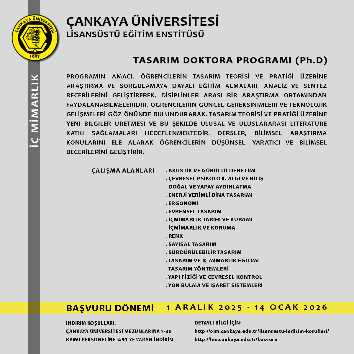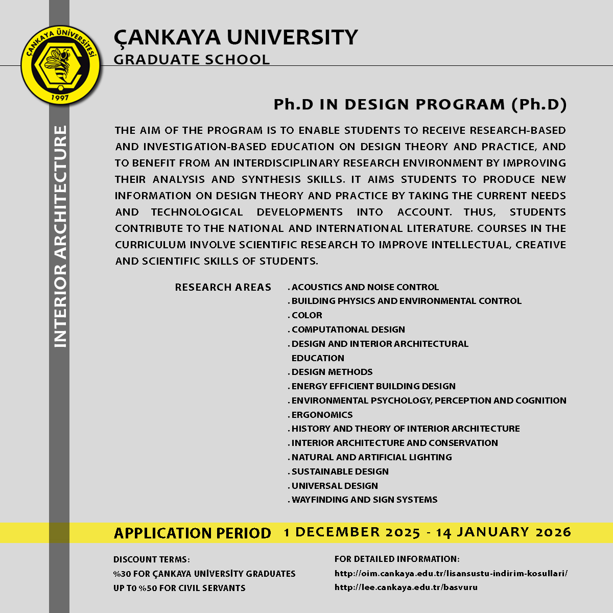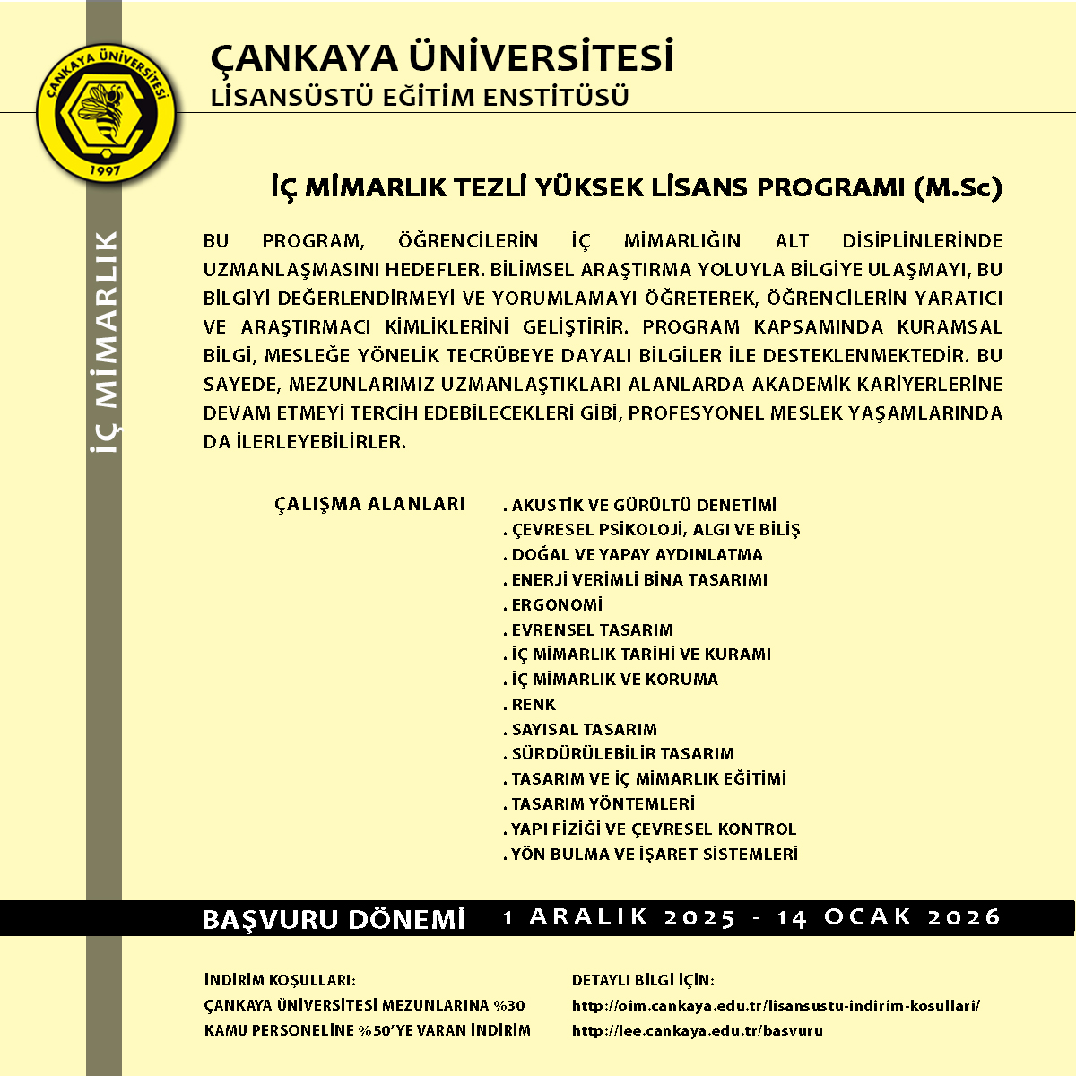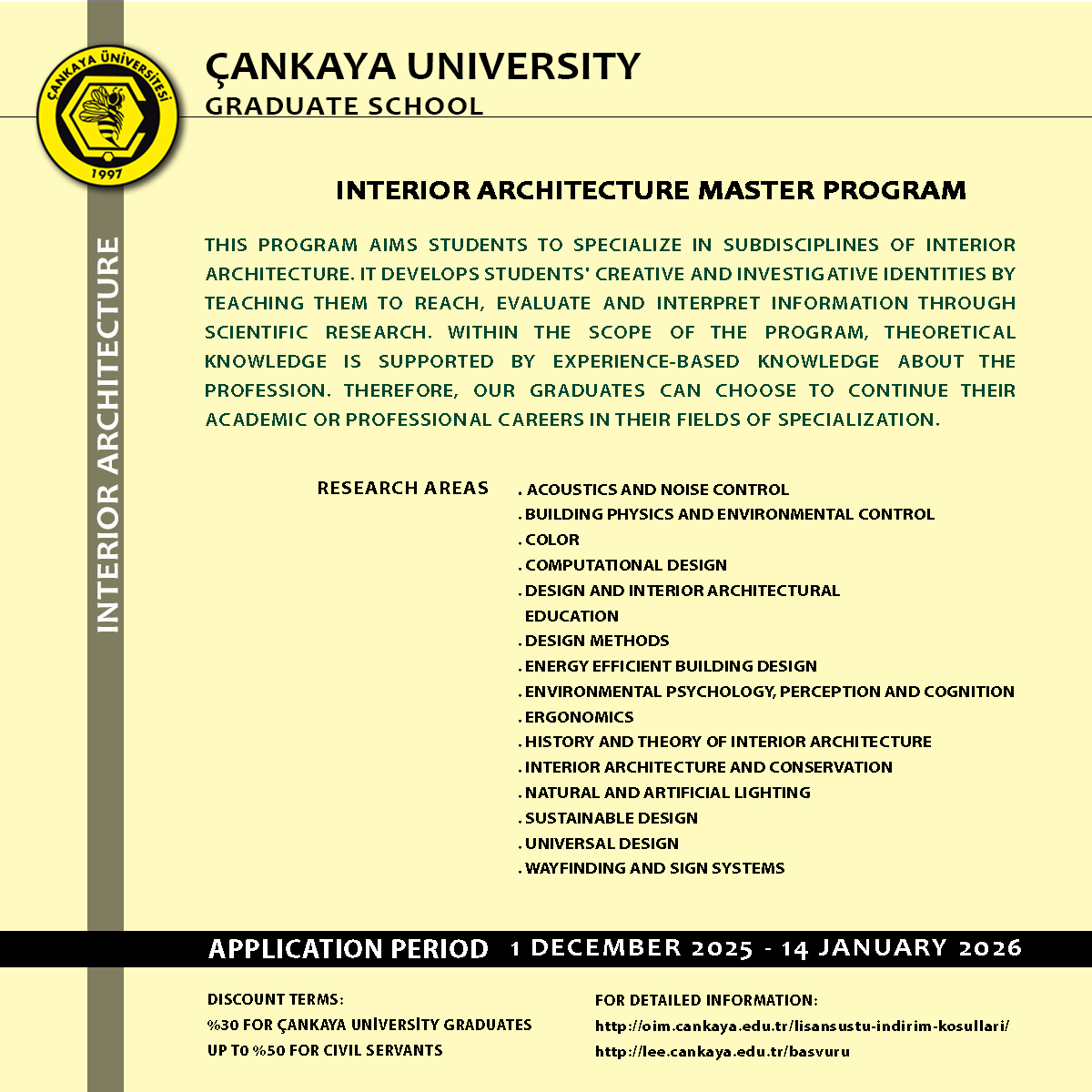 Lisansüstü Eğitim Enstitüsü İç Mimarlık Tezli Yüksek Lisans ve Tasarım Doktora Programları için başvurular 1 Aralık 2025 – 14 Ocak 2026 tarihleri arasında yapılacaktır.